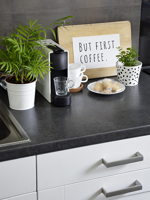 De még a kaspó mögött futó vékony fekete dekortapasszal is jól összejön, ami egyébként a lábazati csempét és a festett falat hivatott elválasztani.