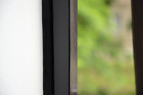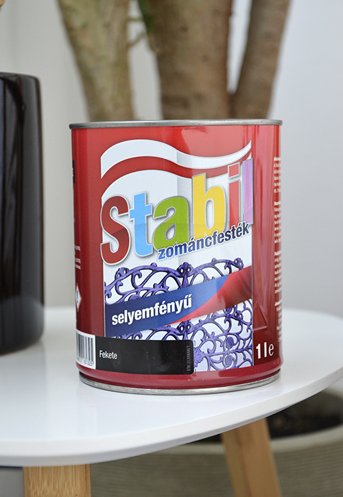 Természetesen a legszebb a hófehér megoldás lenne, csakhogy a szilikon alatt több helyen is ott a sötét szín, a szilikon meg nem festhető (ez az átlátszó típus legalábbis nem), magát a gumis szilikont visszaszedni meg nem tudtam. Úgyhogy vettem egy fekete, selyemfényű, oldószeres zománcfestéket (fémre, fára való, kül- és beltéren egyaránt alkalmazható), amivel egy picit frissíteni tudom az egész ablakszerkezet megjelenését.