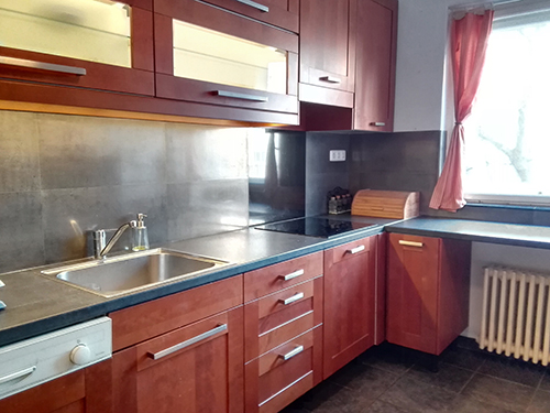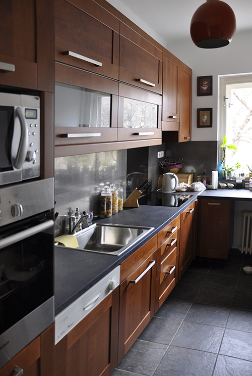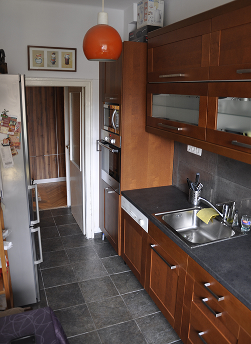 A bútort és a burkolatokat teljes mértékben lecserélték, a gázt kikötötték, így elektromos főzőlap került be, a melegvíz pedig az előszoba parkettája alatt a fürdőszobából van kivezetve (így erre kb. 5-10 mp-et várni kell). A konyhatechnológiai sorrend is másképpen alakult, bekerült egy mosógatógép és egy plusz pult az ablak alá, ami által a munkafelület jelentősen megnőtt. Fontos azonban megjegyeznem egy-két konstrukciós hibát, amit a szakértő szemek biztos azonnal kiszúrtak: az egyik, hogy az újonnan beépített munkapult a radiátor felett van. Ez nem annyira szerencsés megoldás (látvány szempontjából sem). Illetve az alsó szekrények és fiókos elemek mélysége valamint a munkalap mélysége nincs szinkronban egymással. Ennek az az oka, hogy a bútorok Ikeásak (60 cm mélyek), de a munkalap máshonnan van, és sajnos szintén 60 cm mély (és nem 63.5-eset, mint az Ikeásak). Az esztétikumot csak picit rontja, a praktikumot viszont jelentősen: a morzsát pl. nem tudom rendesen a szélekről összegyűjteni, illetve bármilyen, a széleken lefolyó folyadék, a munkalap ívéről a szekrények és fiókok lapjának élére „fordul rá”, és nem a földre csepeg…. Na, nem mintha sokat vizeznék itt, de azért jobban oda kell figyelnem, és azért írtam le, hogy ha új konyhában gondolkodtok, ezt az aprócska szempontot ne hagyjátok figyelmen kívül.