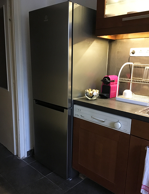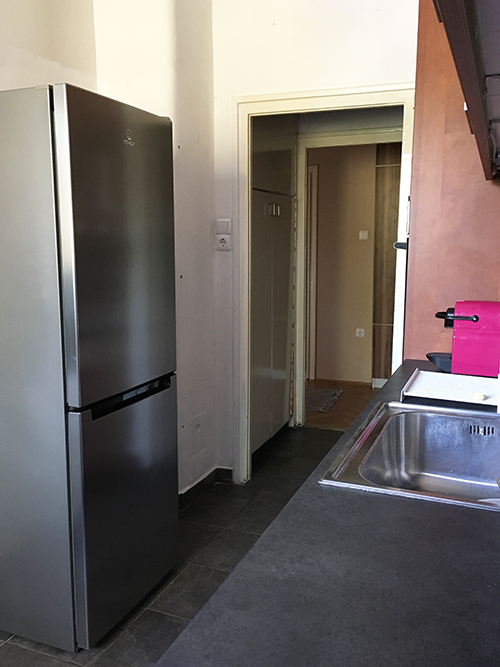 A kis kitérő után menjünk tovább. A hűtő a szemközti oldalon kapott helyet, mellette pedig egy kisebb étkezőasztal is elfért. Ezek a fotók akkor készültek, amikor az előző tulajdonosok még itt laktak (nagyon szerették amúgy ezt a lakást). A hirdetésben én ezzel a fotóval találkoztam: