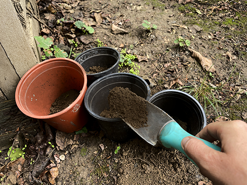 Amíg száradt a felület, addig a komposztáló széléből vettem ki friss, porhanyós, tápanyagban dús földet. Ezt összekevertem a növények alól kiszedett földdel, és így került egyeneltesen szétosztva a műanyag cserepekbe.