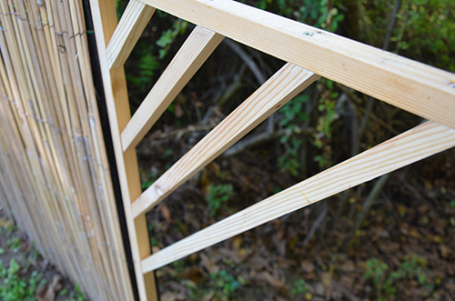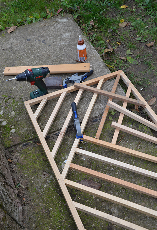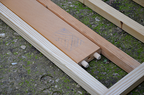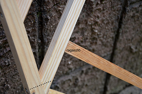 A kerethez – előfúrás után – csavarokkal rögzítettem a léceket. Nem ferdén, a léccel párhuzamosan, hanem a keretre merőlegesen, ezt nem is fotóztam, de talán látszik.