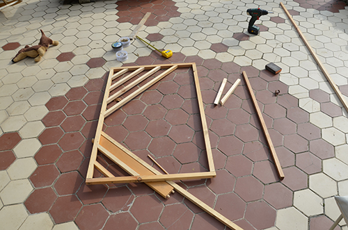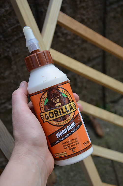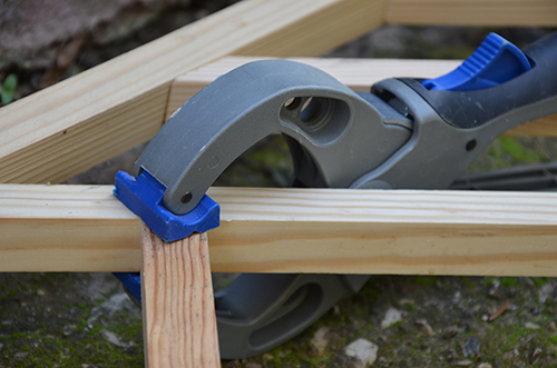 Az éppen száradó elemeket gyorsszorítóval rögzítettem. Igazából ezeket csak éppen annyira kellett odaragasztani, hogy az idő múltával is stabilak legyenek, mert amúgy a vágásoknak köszönhetően ezek szépen csatlakoztak derékszögben, nem a ragasztó „szorította oda” őket. Kávéztam közben, játszottam Francival, meg a poloskákat sepregettem le a teraszról.