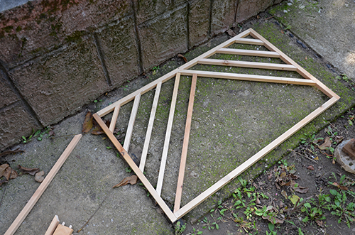 Első lépésként készítettem 23×23 mm-es négyszöglécekből egy 60×100 cm méretű keretet. Ezt dekopírfűrésszel könnyedén leszabtam és előfúrás után csavarokkal rögzítettem egymáshoz.