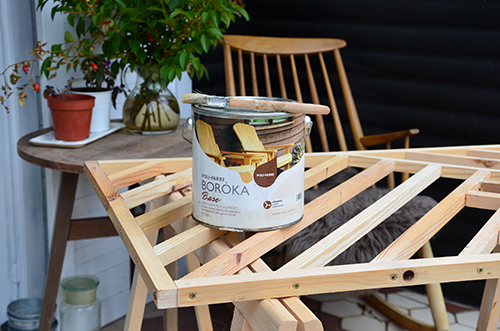 Másnap viszont az első kávé után neki is ugrottam a favédő alapozásnak, amihez Poli-Farbe Borókát használtam. Ezzel két rétegben alaposan átfestettem az egészet ügyelve arra, hogy a résekbe, illesztésekbe is jusson az szerből.