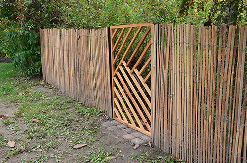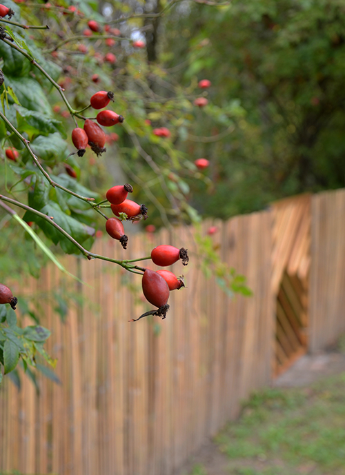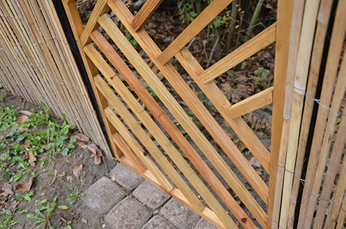 A kapu rögzítését nem gondoltam túl, egyszerűen zsinórral kötöttem az oszlopokhoz. Zsanérral is megoldhattam volna, de nekem így is megfelel most a célnak. Nem nyitogatjuk naponta többször, és mivel ez egy szélvédett rész, a szél sem csapkodja a kaput. Szóval az egyszerűség jegyében így marad a kiskapu.