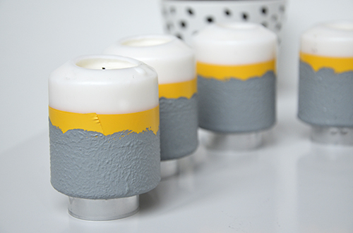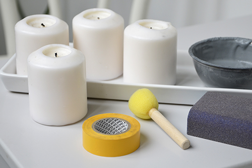 Aki esetleg lemaradt volna az előző posztról, az ITT elolvashatja, miből kevertem ki ezt a festéket. Szóval az újrahasznosítás jegyében fogtam 4 db – korábban már használt – gyertyát, szigetelőszalagot, szivacsecsetet, csiszolószivacsot és a tálka betonhatású festékemet.