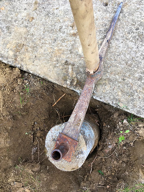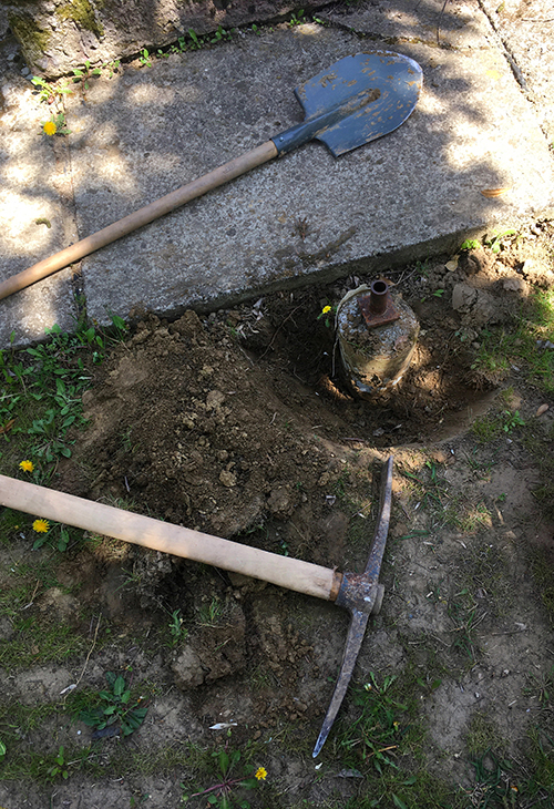 Fűnyíráskor, locsoláskor, vagy simán csak a kertben való közlekedés során többször botlottam meg bennük, és persze a slag kihúzásakor is rendszeresen akadt el ezen a részen a locsolási projekt. Úgyhogy, egyik (áprilisi) nap úgy döntöttem, hogy ideje szembenézni ezzel a dologgal. Fogalmam sem volt, hogy a betonhengerek milyen mélyen vannak a földben, csak sejtésem volt, hogy valahol 50-100 cm között lehetnek.