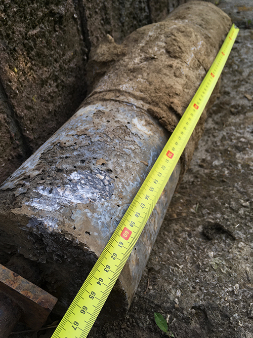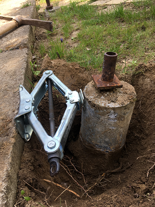 Viszont a csákány remekül működött emelőként. Persze, fokozatosan emelni kellett az alátámasztást (ezt keramitokkal oldottam meg), és végül a betonhenger, ami egyébként 63 cm hosszú, egyszercsak kint volt a földből.