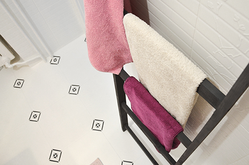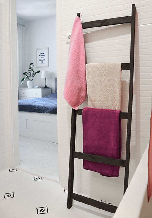Miután kész a létra, már csak a helyére kell állítani. Ez pl. lehet a fürdőszobában, és funkcionálhat törölközőtartóként: