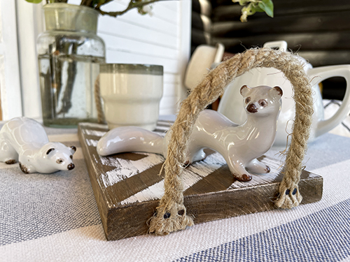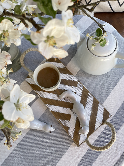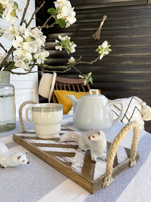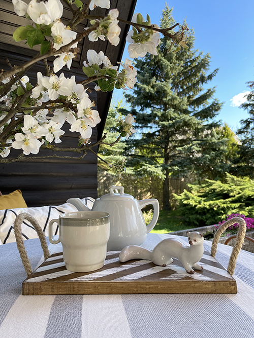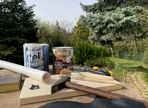 A tálca alapszínéhez Poli-Farbe Boróka vizesbázisú lazúrt használtam (dió árnyalatút), amit már oly sokszor láthattatok a blogon. Az ITT listázott posztokban visszanézhetitek, hogyan mutat lépcsőn, kiskapun, tekebábukon, stb. Ugyancsak Poli-Farbe termék a Cellkolor Aqua zománc is, amit nem csak itt a faháznál, de otthon is előszeretettel alkalmazok, ha valamit fehérre szeretnék festeni. ITT van a bejegyzések listája, ahol ezzel dolgoztam.