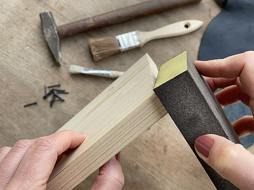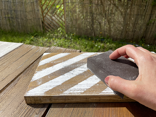 A fehér festéket is több rétegben vittem fel, és mivel ecsettel dolgoztam, az ecset száliránya látszódott. Ezért az utolsó réteg teljes száradása előtt kitaláltam, hogy egybekoptatom a lazúros és a festett réteget. Ehhez benedvesítettem egy finomszemcsés csiszolószivacsot, és így csináltam a koptatást. A végén az egészet vízzel lemostam és szárazra töröltem.
