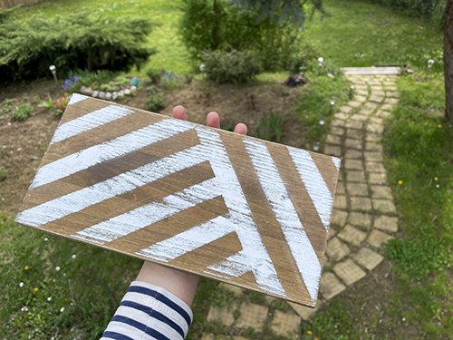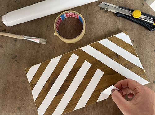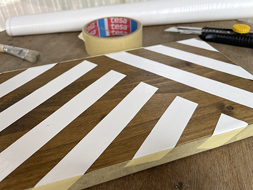 A minta kialakításához az öntapadós fóliával dolgoztam. A maszkolószalag sokkal jobb választás lett volna, de itt a faháznál vékony maszkolószalagom nem volt, az öntapadós fóliából viszont könnyen lehetett a hátulján lévő rácsozás mentén egyforma széles csíkokat vágni.
