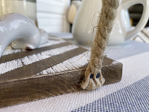 Végül már csak a kenderkötél darabokat szögeltem a deszka két oldaláre. Egy kötélvéget összesen 5 szög tartja, ebből 3 nem látszik. A szögelés sorrendje: egy középre, egy-egy oldalra, és végül kettő oda, ami a fotón is látható. Ezt is be lehet lakkozni a végén, hogy a kötél a sokadik használat után is bírja.