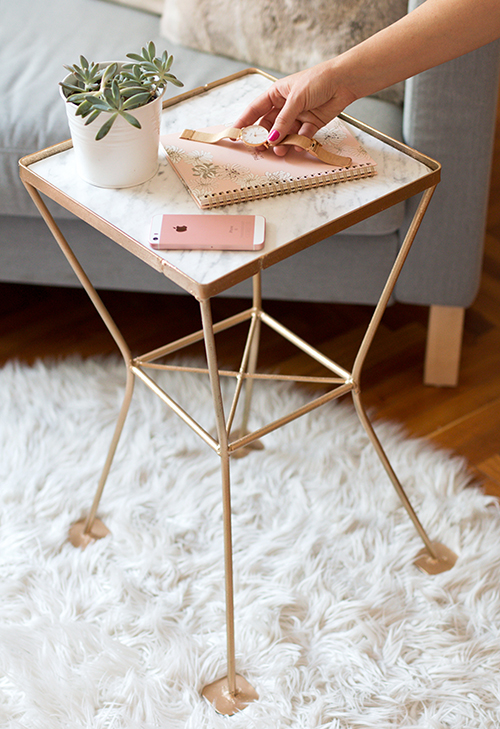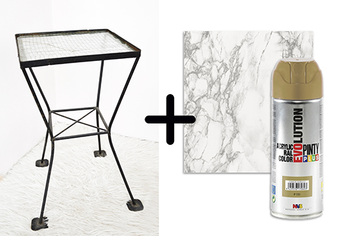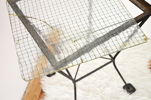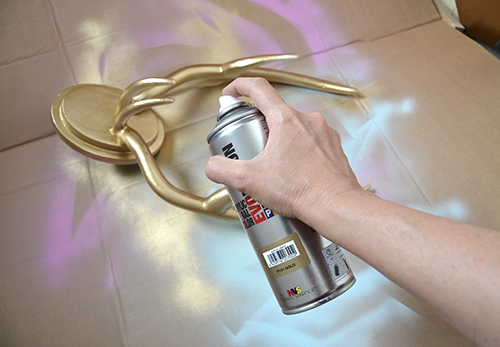 A fém vázat és a dróthálós üveglapot is alaposan lesikáltam, hogy semmilyen kosz ne legyen rajtuk. A vázat először alapozóval fújtam át, majd a Novasol P151-es arany sprayfestékével. Ez az egyik kedvenc árnyalatom, az előszobai agancsom is ezzel lett átfújva (ez szerepel a könyvemben is az előszobában):