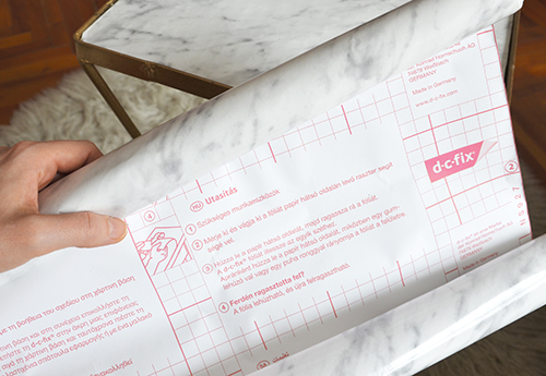A Praktikerben számos öntapadós fólia is kapható, sőt a márványmintásakból is van több árnyalat, én egy egészen világosat választottam.