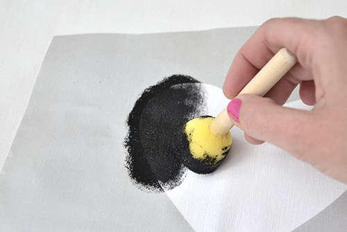 Ehhez a sablont öntapadós fóliából készítettem és fekete textilfestékkel színeztem be úgy, hogy a textil alá egy kartont raktam. A megszáradt festéket sütőpapíron keresztül közepes álláson 3 perc vasalással fixáltam.