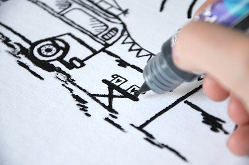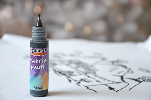 Ezután a papírt becsúsztattam az előzőleg mosással beavatott pólóba, és tubusos textilfestékkel (aminek ún. csőrös vége van), meghúztam a mintát. A vékonyabb vonalakhoz és a kisebb mintákhoz fogpiszkálót is használtam.