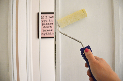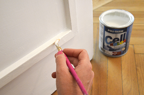 Az ajtó tokja púder színű lett, amit szintén Pentart akrilokból kevertem. Egyrészről azért, mert a tokhoz hozzáérő kulcsok nyoma ezen a picit sötétebb árnyalaton kevésbé észrevehető, mint egy hófehéren, másrészt, hm… elképzelhető, hogy az ajtóm belül púder színű? Haha, el bizony, de erről majd később tartok fotókkal illusztrált beszámolót.
