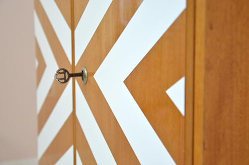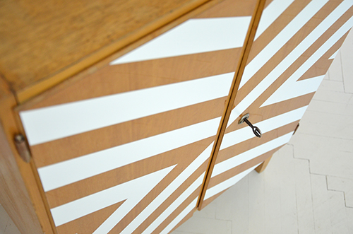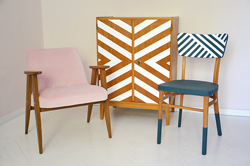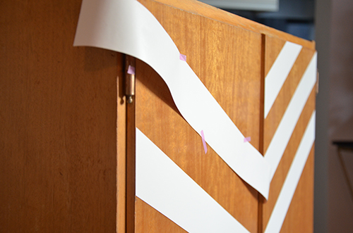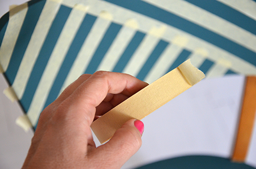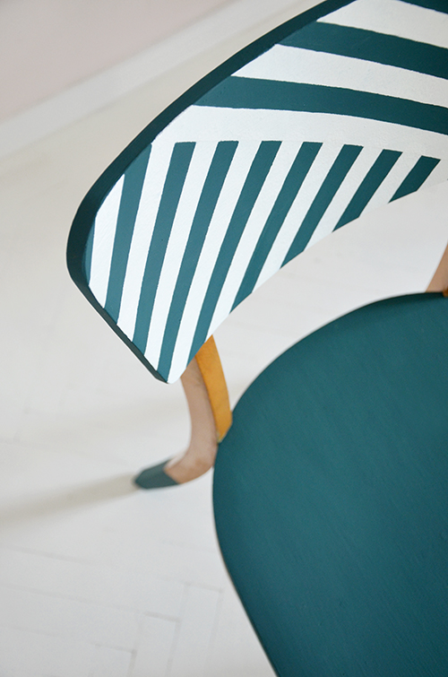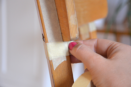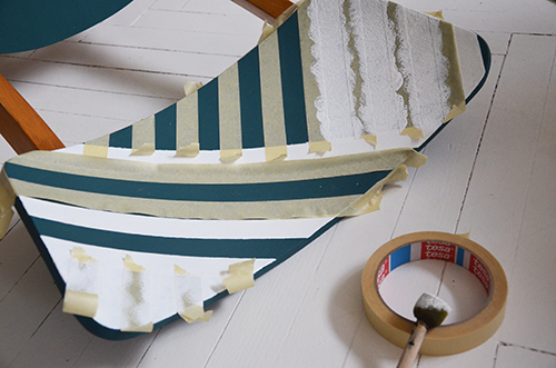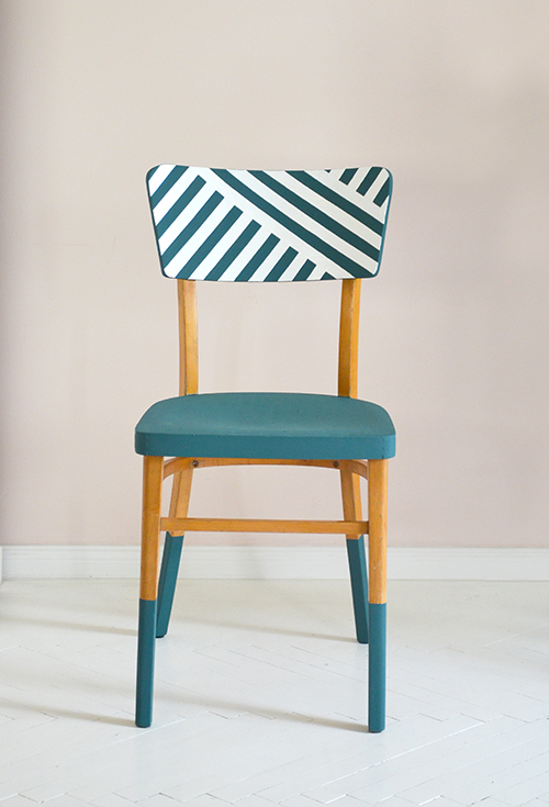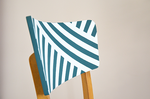 Viszont így a támlát vettem célba. Megint maszkolószalagot használtam, de ezúttal a minta megtervezéséhez. A felragasztott csíkok kontúrjait ceruzával halványan meghúztam, és – most jön a csavar – átragasztottam a maszkolószalagot úgy, hogy az eddig ki nem takart részek legyenek takarásban.