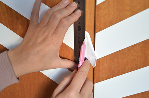 Én csíkokkal és a végén háromszöggel is dolgoztam, de természetesen öntapadós fóliából bármilyen tetszés szerinti forma kivágható és felragasztható, a kialakítható minták száma határtalan. Sőt még elrontani sem lehet, a dekorfólia ugyanis nyom nélkül visszaszedhető a felületről.