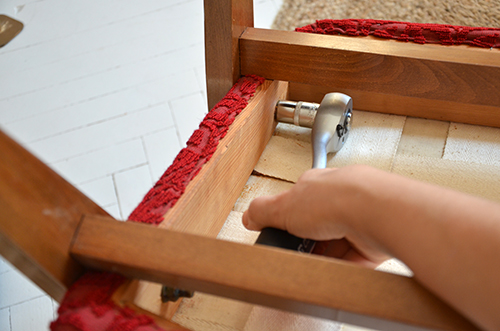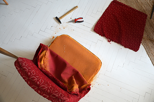 Először szétcsavaroztam a lábakat és az ülőrészt, majd lebontottam a kárpitot.