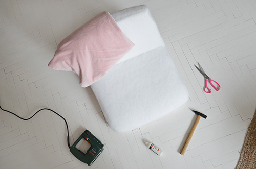 Az ülőfelületre és a háttámlára egy vastag flízt ragasztottam (ez egy kültéri napozószék belseje volt), melyre rákerült egy vékony flíz is. A flízt egyébként Röltexben lehet venni méterre.