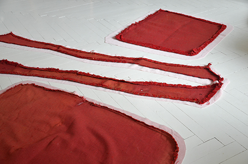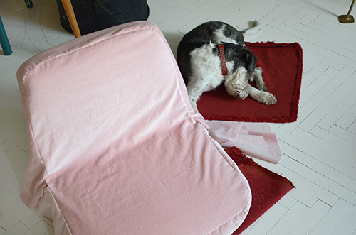Szóval a lebontott kárpitról szabásmintát vettem, majd kiszabtam és varrógéppel, illetve kézi öltéssel megvarrtam az új anyagból a huzatot.