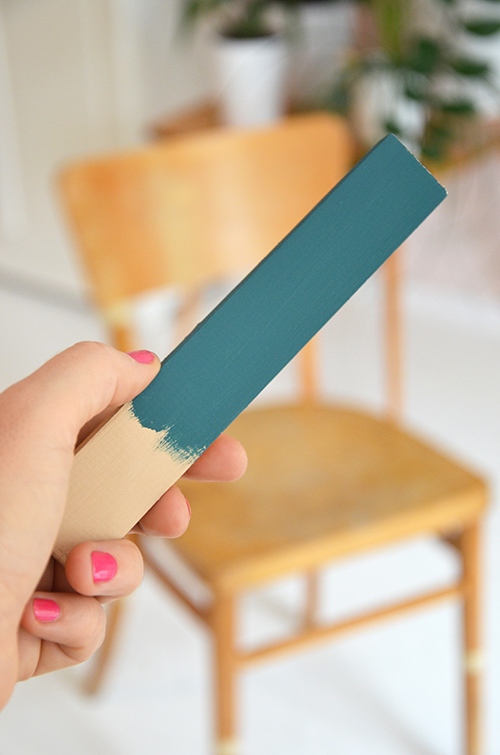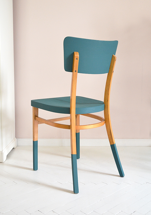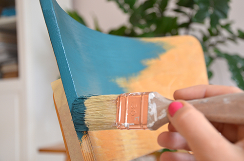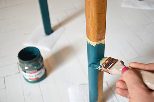Ezután szivacsecsettel pamacsoltam végig az egészet, szintén két rétegben. Itt azért fontos tudni, hogy a pamacsolás miatt a festett résznek lesz egy kis textúrája, és az is előfordulhat, hogy a maszkolószalag alá folyik a festék. Utóbbit vékony ecsettel lehet javítani teljes száradás után. A legvégén mehet rá lakk, vagy wax, hogy még tartósabb legyen a végeredmény.