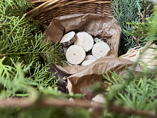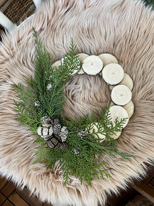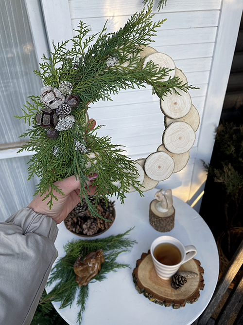 Az elkészült kis koszorúm így nézett ki, mielőtt útnak indultam volna vele a faházhoz.