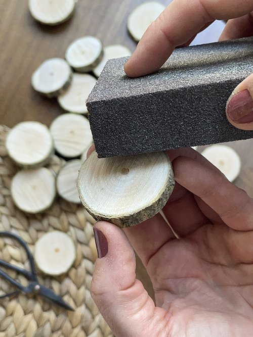 A kb. 4-5 cm átmérőjű, 7-8 mm vastag szeleteket először megcsiszoltam. Ezt lehet géppel is csinálni, de úgy voltam vele, hogy most jólesik tea és illatos szójagyertya mellett otthon, a télikertben kézzel elbíbelődni ezzel.