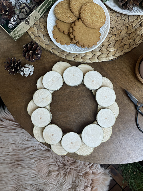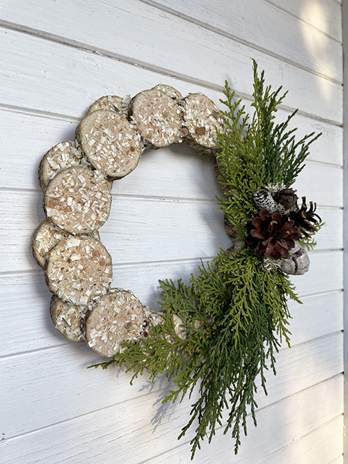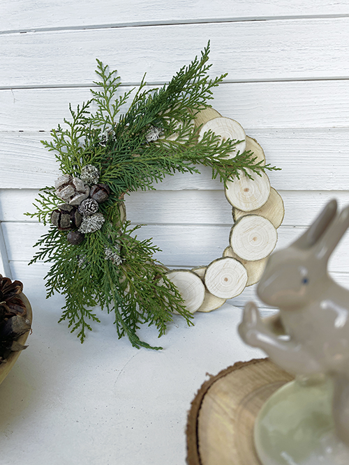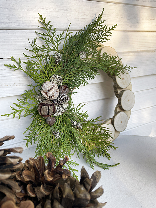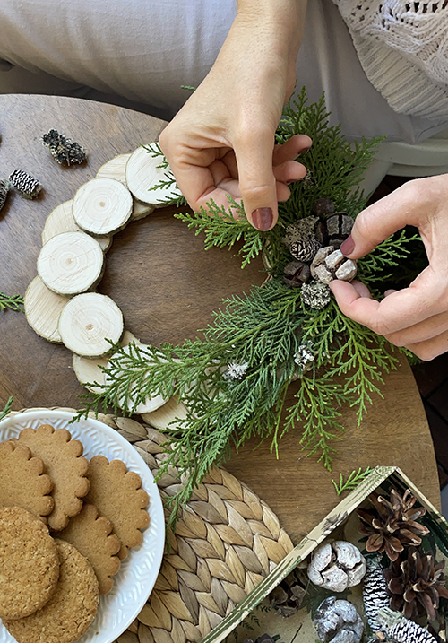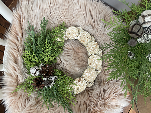 Az imént említett faforgácsot kipróbáltam egy másik koszorún, amolyan természetes „glitterként”. Faragasztóval vékonyan bekentem a felületet és beleszórtam az apró szemcséket. A további díszítést a másik koszorúhoz hasonlóan csináltam.