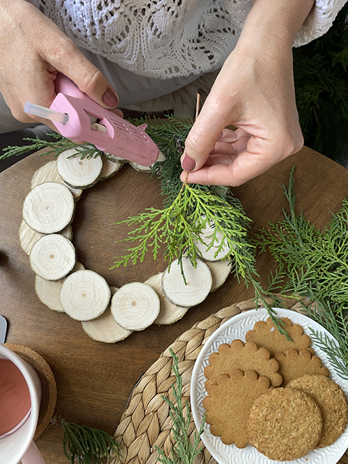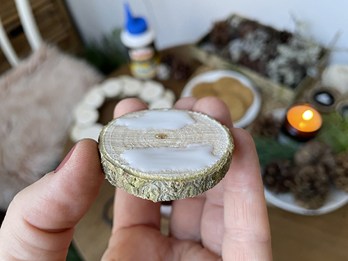 Az egymáshoz rögzítéshez én vízálló, mindent kibíró faragasztót használtam, pontosan azért, mert én ezt a dekorációt a faház teraszára készítettem. A ragasztópisztolyos rögzítést kültérre, fa szeletekhez nem ajánlom, a hidegben a ragasztó annyira megdermed, hogy a szeletek a súlyuknál fogva egyszerűen szétesnének.