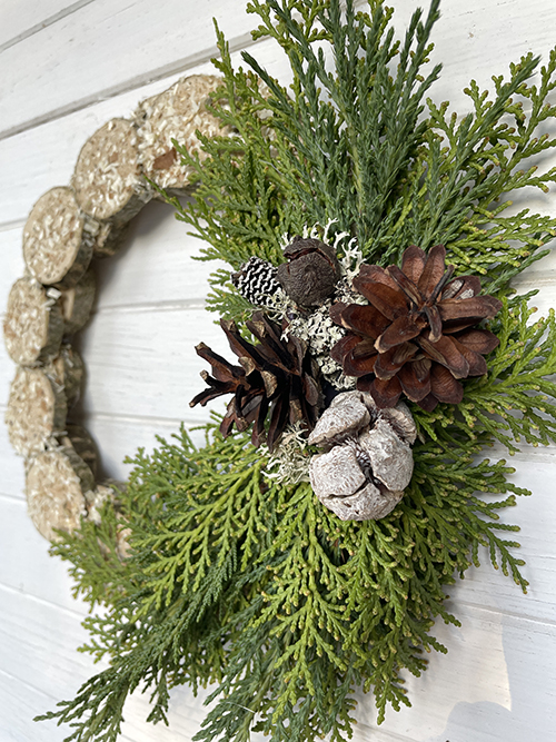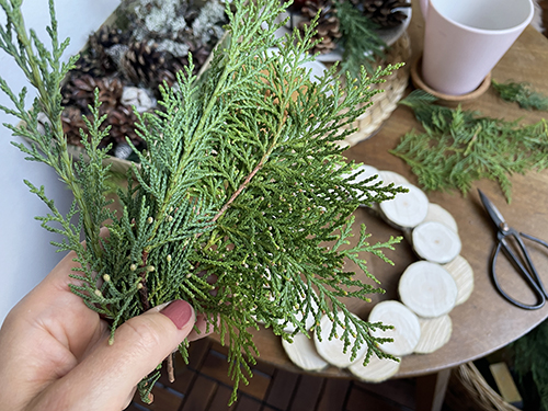 Miután megszáradt a koszorú alapja, jöhetett a díszítés: boróka és tuja ágakkal előbb a zöld részek kerültek fel, majd kisebb tobozok, száraz növények. Ezekhez viszont ragasztópisztolyt használtam, könnyebb darabok, ezek valószínűleg kibírják az ünnepi időszak végéig.