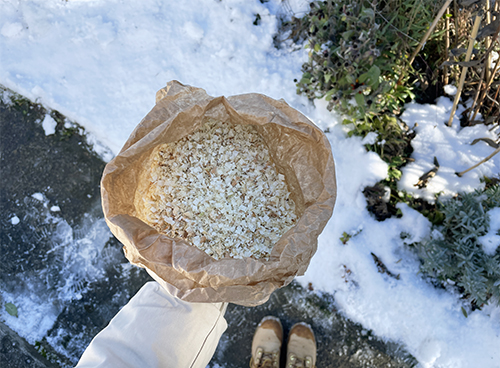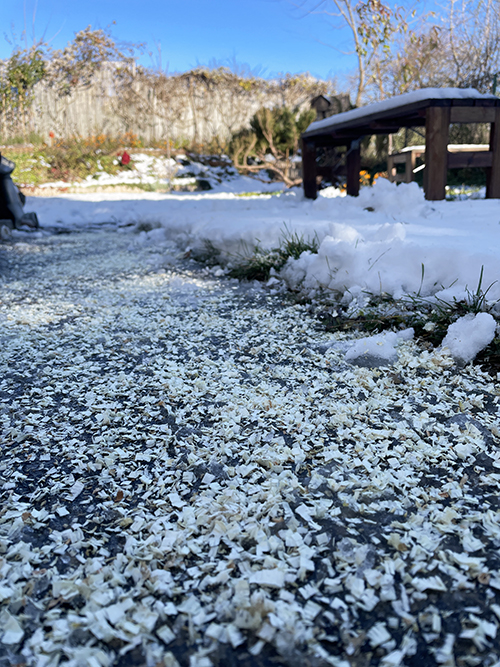 Némi forgács is keletkezett a korongok szeletelése során, ezt összegyűjtöttem, és nem is kellett sokat várni a felhasználáshoz, ugyanis legnagyobb meglepetésemre leesett az idei első hó… Szóval ezzel szórtam fel a hótól letakarított járdát a ház körül.