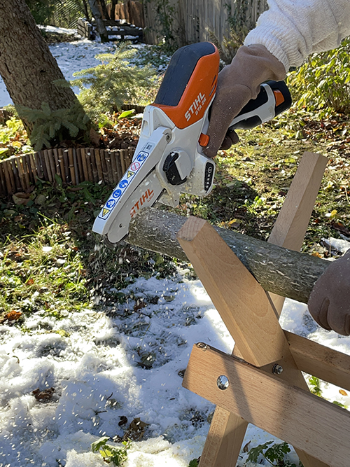 A szeleteléshez ismét a STIHL GTA 26 kézi, akkumulátoros ágvágómat használtam, amivel 8 cm átmérőig bátran lehet vágni bármilyen nyers fát. Őszintén szólva ez a kis masina az idei legjobb befektetésem volt, nagyon megkönnyítette a szezonban a karbantartással járó kerti munkákat, és hát a dekorációsokat is, számos különféle DIY projektjemben volt a segítségemre. Talán emlékeztek, az első a rovarhotel volt, ITT.
