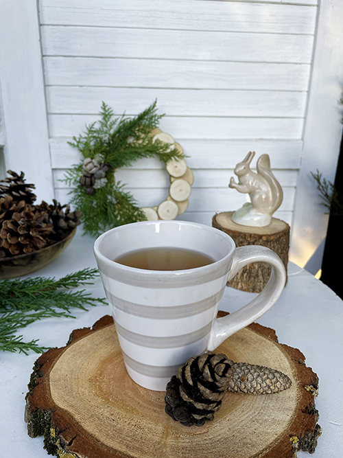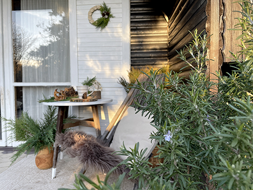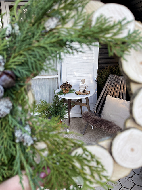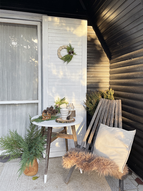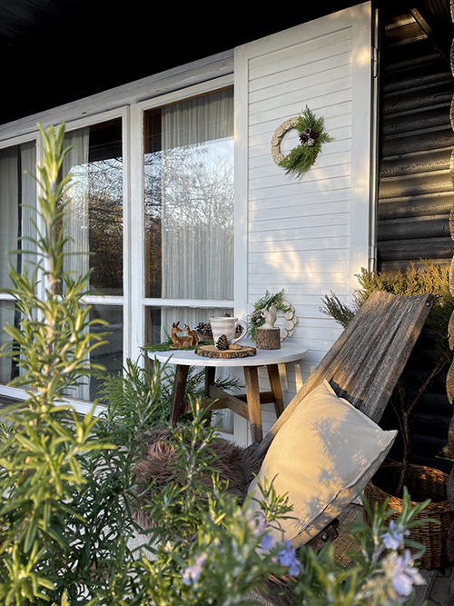 Olyan szép fények voltak délután, hogy miután végeztem a hólapátolással, a forgács szórással, és letakarítottam a teraszt is a hótakarótól, berendeztem itt a kedvenc kis sarkomat. A két fa korongos koszorú mellé jött még néhány boróka ág, egy-két porcelán nipp, tobozok, szőrme, párna, és persze egy bögre forró tea…