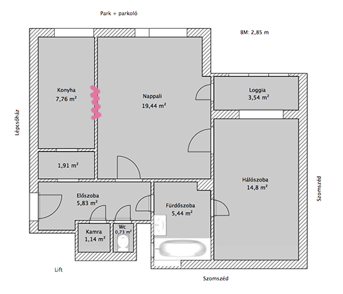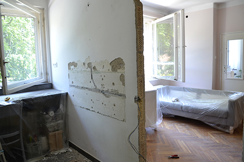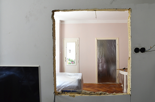Na de, a falbontás!!! Amikor beköltöztem többen is írtátok az alaprajz láttán, hogy egybenyitnátok a nappalit és a konyhát. Én ezen több okból is hezitáltam. Egyrészről a konyha és a nappali padlójának szintje között van 3 cm eltérés, mert a konyhában az új burkolat a régire lett rátéve. Ez mondjuk a kisebbik kontra érv volt. A másik, hogy pont ott, ahol a nyílás ideális lenne az épp egy kötődoboz alatt van, tehát elektromos vezetékek futnak lefele, és ez mindkét oldalon több konnektort is érint, így villanyszerelés is szükséges. Arról nem is beszélve, hogy az antennakábel is ezen a falon fut keresztbe… A harmadik, de azért mégis fontos érv, hogy a konyhai szagok ezzel a falbontással mindenfelé szétterjednek majd a lakásban.