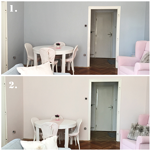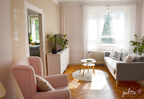 Közben festegettem a nappali falát szürkére meg púderre (erről Facebookon adtam hírt, haha, kemény menet volt), de mivel időközben egy falbontást is beszerveztem, így ennek a projektnek a befejezése és a közzététele még várat magára….