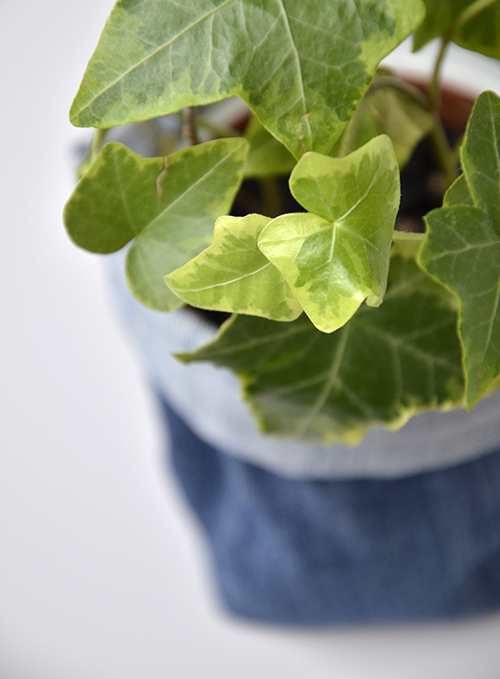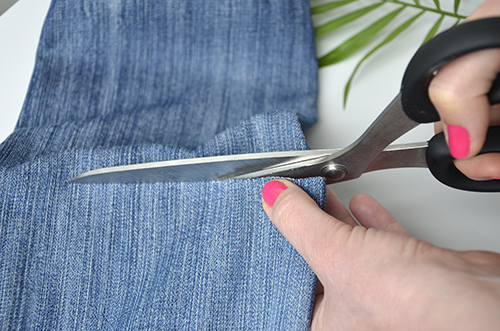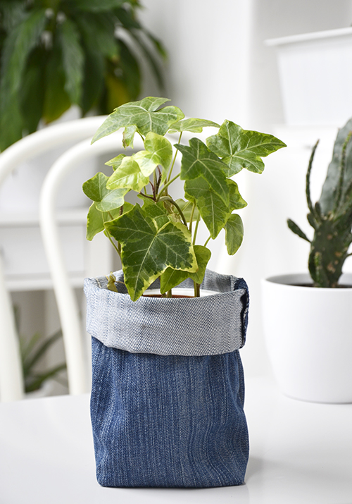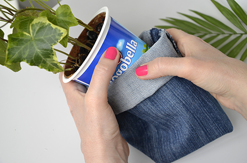 Első lépésként visszahajtottam a farmer szárát és így mértem ki, kb. mekkora darabra lesz szükségem. Én egy hosszúkásabb kaspóhoz kalibráltam a dolgot, pontosabban – az újrahasznosítás jegyében – egy nagyobb méretű joghurtos poharat vettem alapul, így nagyjából 30 cm-t vágtam le a nadrág szárából.