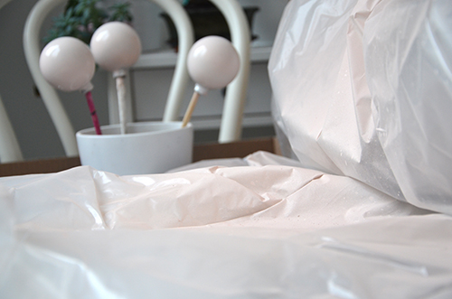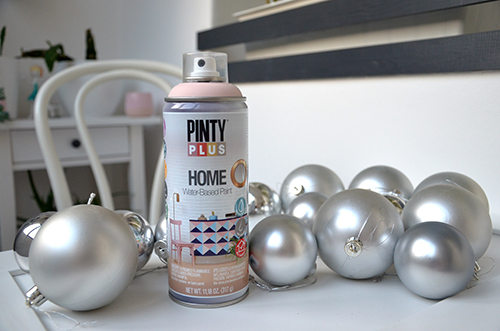 A díszek átszínezéséhez a Pinty Plus legújabb, HOME nevű sprayfestékét használtam. Ez egy vízbázisú, szinte szagtalan, beltéren is használható festék, de azért így is érdemes letakarni a fújás körüli tárgyakat, és a padlót is. Én 2 rétegben vittem fel a festéket alapozás nélkül, a rétegek között 1 órát vártam.