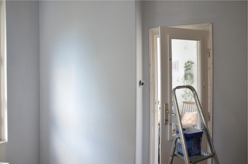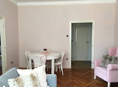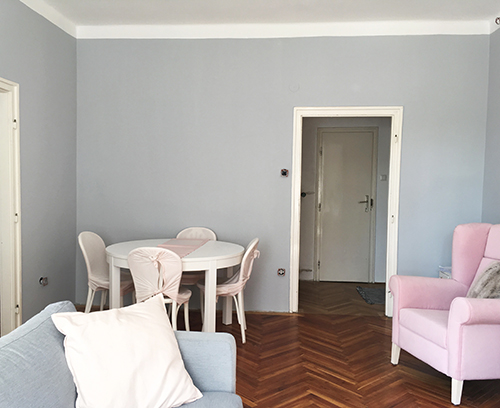 Eredeti terv szerint arra gondoltam, hogy ezúttal nem púderszínű lesz a fal (Poli-Farbe Platinum – Árvalányhaj), mint az előző lakásomban ITT, hanem szürke. Láttam magam előtt, hogy a szoba ezzel az árnyalattal, a hatalmas ablakkal és a régi parkettával sokkal inkább a nagypolgári stílus felé hajlik majd. Gondoltam, milyen jól mutatnak majd a fehér bútorok és a púder fotel a szürke fal előtt.