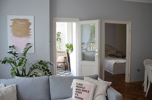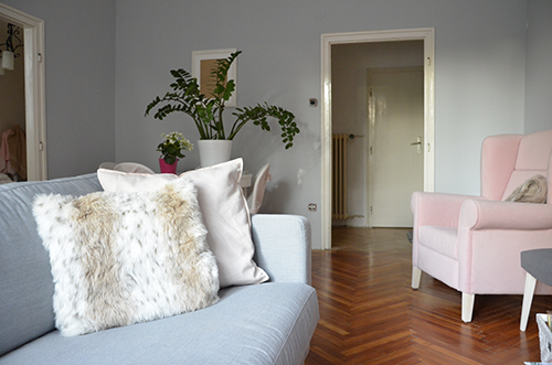 Ezúttal a Poli-Farbe Platinum – lisztes üröm színére esett a választásom, ami a 2017-es színárnyalatok egyike. Ez passzolt ugyanis a legjobban a szürke Ikeás kanapémhoz, szerettem volna, ha összhangban vannal. Két falat teljesen át is festettem, nagyon szép volt az árnyalat és valóban hozta azt a klasszikusabb hatást, amit elképzeltem, tökéletesen passzolt a kanapé színéhez is. Mégsem voltam maradéktalanul elégedetett. Néztem napközben, a lemenő nap fényénél, a púder fotellel és valami nagyon kavargott bennem. Egész éjjel forgolódtam, mászkáltam, agyaltam, alig vártam, hogy feljöjjön a nap… Az előző lakásomban már volt hasonló árnyalatú szürkém, de ott fehér parkettával és emiatt sokkal finomabb, nőiesebb volt az összhatása. ITT van egy korábbi poszt, amiben látszódik.