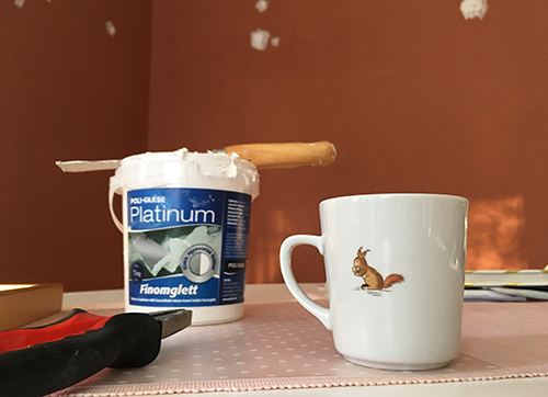 A bútorok az Ikeából vannak, ITT írtam róla. Három különféle árnyalat volt a falon: egy vaníliás, egy cappuccinós, és egy bordó. Előbbi kettővel még egész jól elvoltam, de a bordó köztudottan nem az én színem. Első körben a lyukakat, repedéseket javítottam ki, szerencsére ehhez elég volt a Platinum finomglett, ami használatra kész állapotban kapható, így nem porból kell kikevergetni. Mindezt hajnalban, és amíg száradt a glett, elmentem egyet futni. Hatékonyság Juditu módra, oh yeah!