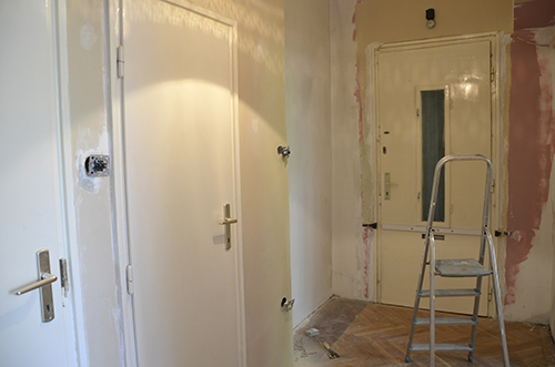 Nos, ilyen ajtókat már festettem az előző lakásomban (ITT), szóval, ez a feladat sem volt új. Először is ajtót festeni mindig célszerűbb leszedve és fektetve, de nekem ez túl macerás, 3 ajtó bakokra fektetve sok helyet foglal, időben dupla annyi, hisz nem lehet egyszerre a két oldallal dolgozni. Úgyhogy, én inkább megtanultam leszedés nélkül lefesteni az ajtókat. Azt ugye mondanom sem kell, hogy a felület legyen tökéletesen por- és zsírmentes, és a kilincseket le kell szerelni a festés idejére.