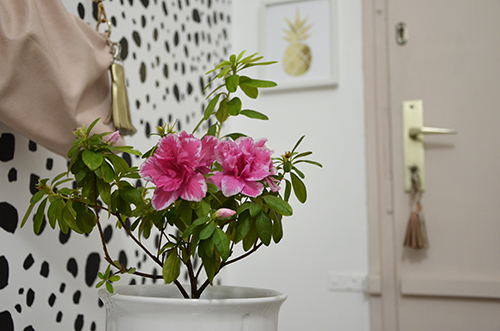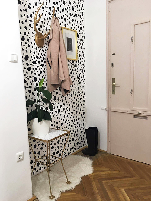 Végül a bejárati ajtót púder színűre, a bemélyedő előszobafalat dalmata mintásra festettem, az ajtók pedig dekortapaszos díszítést kaptak.