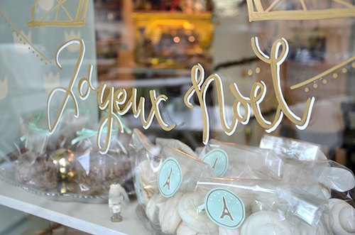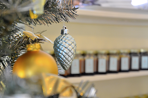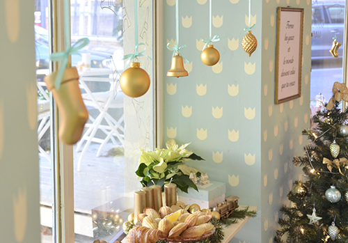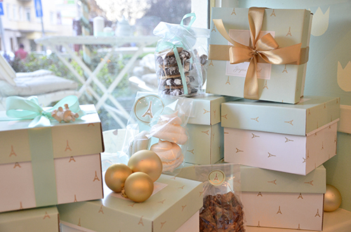 Az ablakokba a karácsonyi Flore kollekcióból tettünk ki ízelítőt, habcsókot, cukros diót és kekszeket, és az ajándékdobozokat is szépen egymásra halmoztuk.