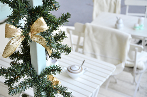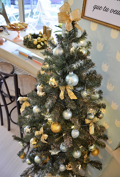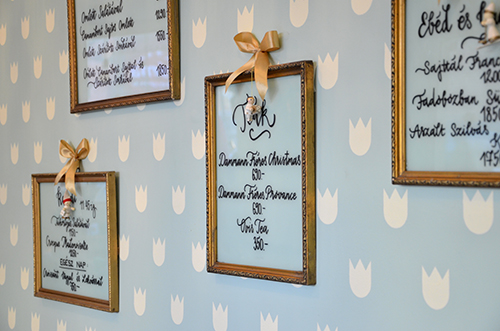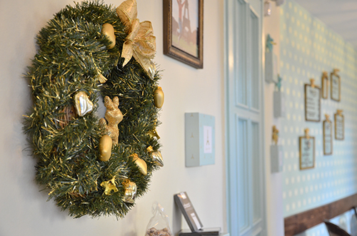 Szóval, az magától értetődő volt, hogy színekben az arany fog dominálni, hisz a kávézó menta-vanília alap színvilágához kezdettől fogva ezt használtuk kiegészítő metál árnyalatnak is (pl. csillárok, képkeretek, kilincs, stb.), így egy kis ünnepi cicoma remekül összecseng a már meglévő elemekkel. A nagy „tulip mintás” falra most masnis képkeretek kerültek fel, menta színű üvegtáblákkal, amiken díszes felirat jelzi az aktuális kínálatot. Ilyen letörölhető / újraírható táblát már magamnak is csináltam, ITT megnézhetitek hogyan.