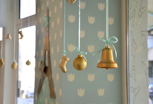 Az ablakok mentén különféle arany díszek lógnak, menta színű masnis szalagon. Ezeket kínszenvedés volt felrakni, mert szöggel és kalapáccsal nehezen lehetett hozzáférni az álmennyezet rögzítésre alkalmas oldalához, de megoldottuk.