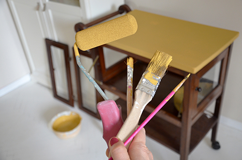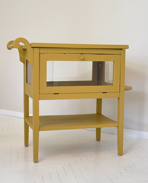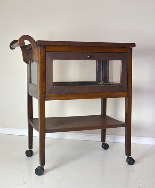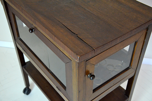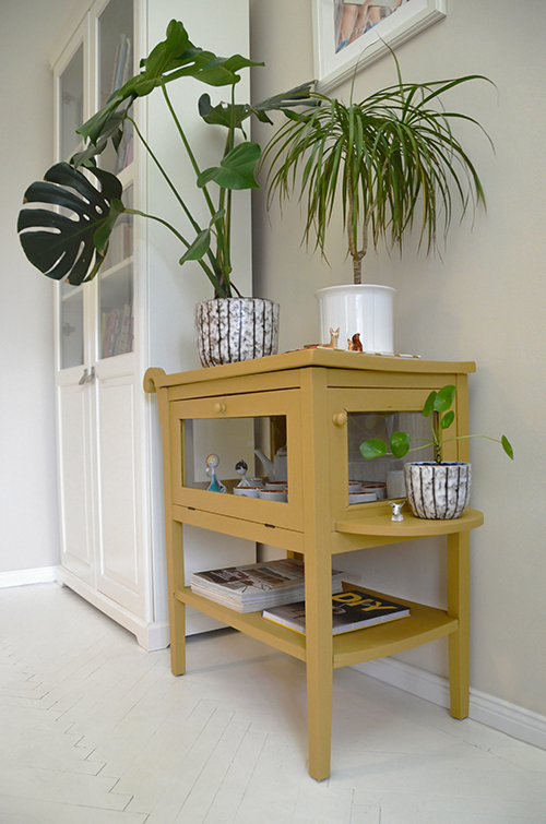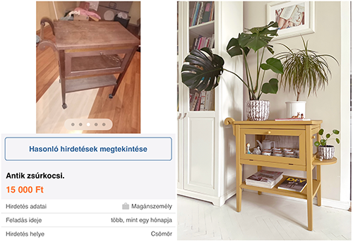 A végén átlátszó viaszpasztával kentem át az egész bútort. A számomra stílusidegen, utólag rá eszkábált műanyag görgőket leszedtem, mert valójában ezek nélkül is tetszik és ez bármikor pótolható szebb darabokkal, ha egyszer a jövőben zsúrkocsinak használnám.